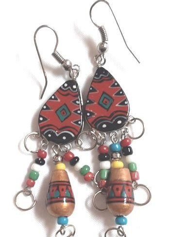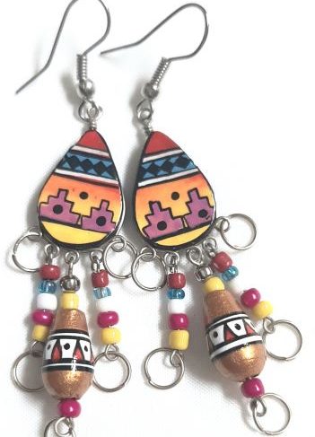These earrings are made of wood painted in various colorful designs. They are made by Peruvian artisans.